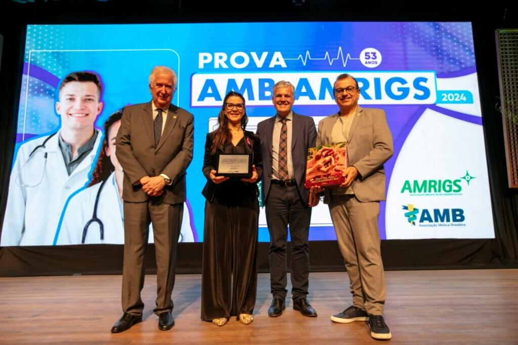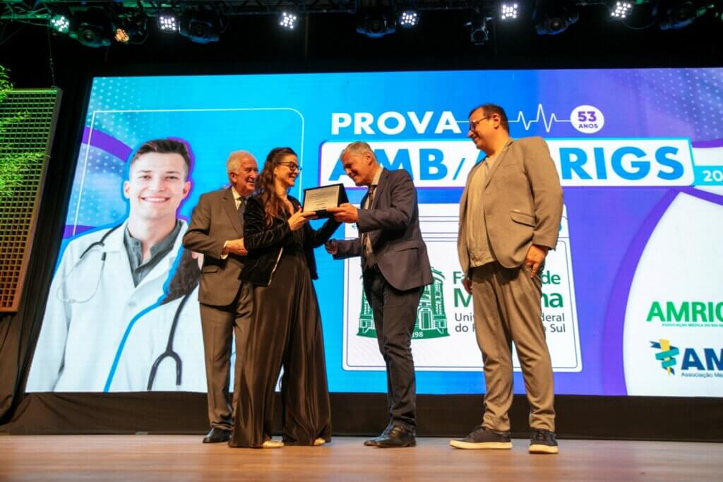 A honraria foi entregue à diretora da FAMED UFRGS, Dra. Cristiane Bauermann Leitão, e ao vice-diretor, Dr. Leandro Meirelles Nunes, em momento conduzido pelo coordenador da Prova, Dr. Antonio Carlos Weston, e pelo vice-presidente da Associação Médica Brasileira da Região Sul, Dr. Juarez Molinari.