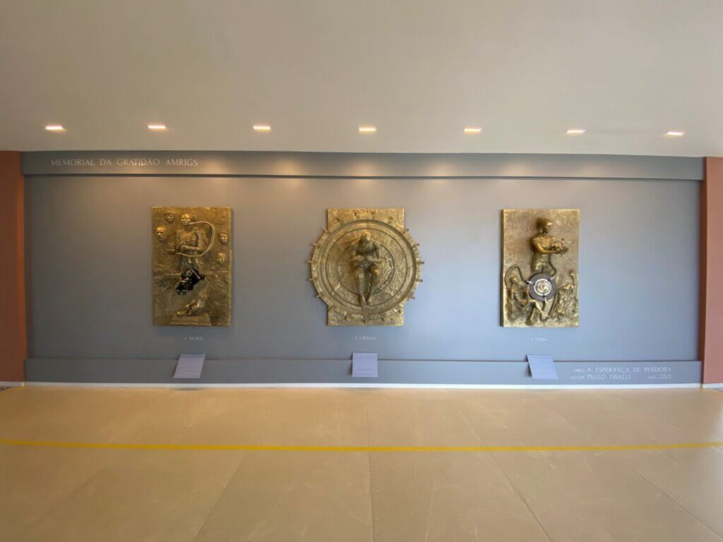 Inaugurado em dezembro de 2021, durante as comemorações dos 70 anos da AMRIGS, o Memorial da Gratidão presta uma homenagem aos médicos e médicas que atuaram no combate à COVID-19 e àqueles que perderam a vida em razão do vírus. A escultura em bronze, com mais de sete metros de extensão, apresenta três painéis em alto-relevo que representam três momentos do período da pandemia: a morte, a ciência e a cura. O monumento traduz a valorização da Medicina e a dimensão cultural e emocional do propósito da AMRIGS.