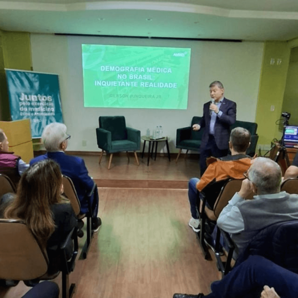 O presidente da AMRIGS, Dr. Gerson Junqueira Jr, compareceu ao evento, representando a entidade, e ministrou a palestra “Demografia Médica no Brasil – Inquietante Realidade”, sobre tópicos referentes ao cenário atual da profissão no país, como o aumento de escolas de Medicina sem a devida infraestrutura, a realidade atual da assistência médica e a possível criação de um exame nacional de proficiência para médicos.