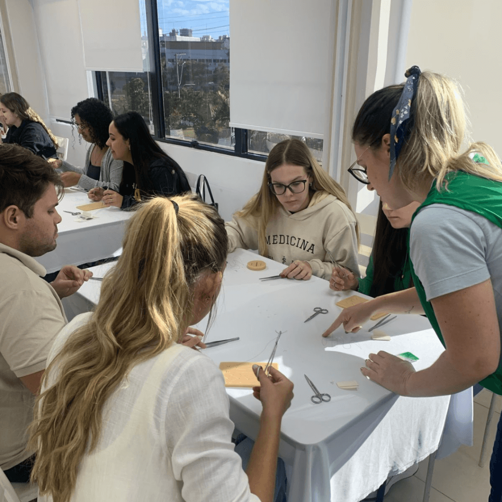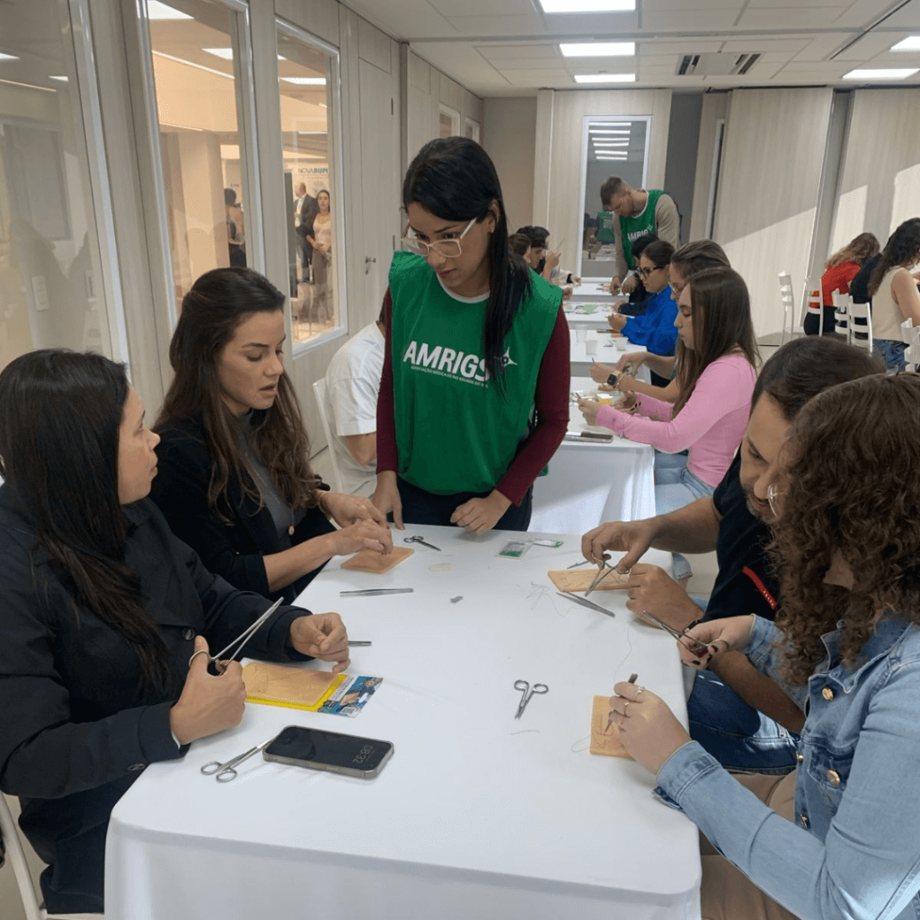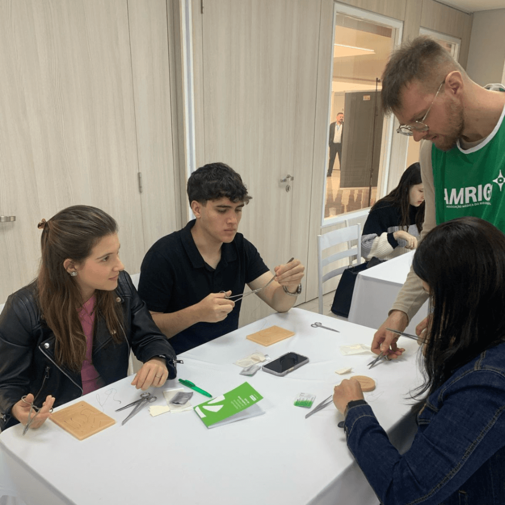 Os acadêmicos participaram, na sexta-feira, de uma noite de aulas teóricas sobre conceitos fundamentais de sutura manual, como paramentação, instrumental, tipos de feridas e cortes, além de como realizar com segurança e eficiência os principais tipos de sutura. Na ocasião, o presidente da AMRIGS, Dr. Gerson Junqueira Jr., conduziu uma aula sobre os conceitos de sutura manual. No dia seguinte, os estudantes foram encaminhados ao Centro de Simulação e Treinamento da AMRIGS, para a etapa prática.