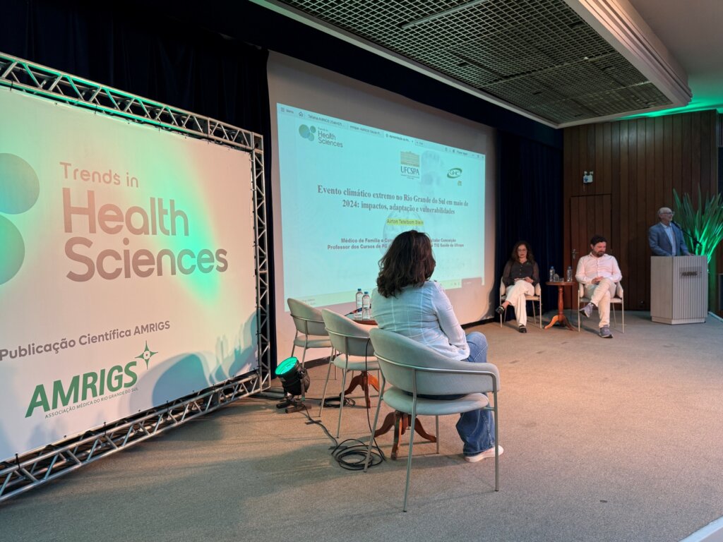 A primeira apresentação feita por Airton Stein, médico de Família e Comunidade do Grupo Hospitalar Conceição e professor da Universidade Federal de Ciências da Saúde de Porto Alegre (UFCSPA), mostrou os efeitos das mudanças climáticas na saúde local e global.